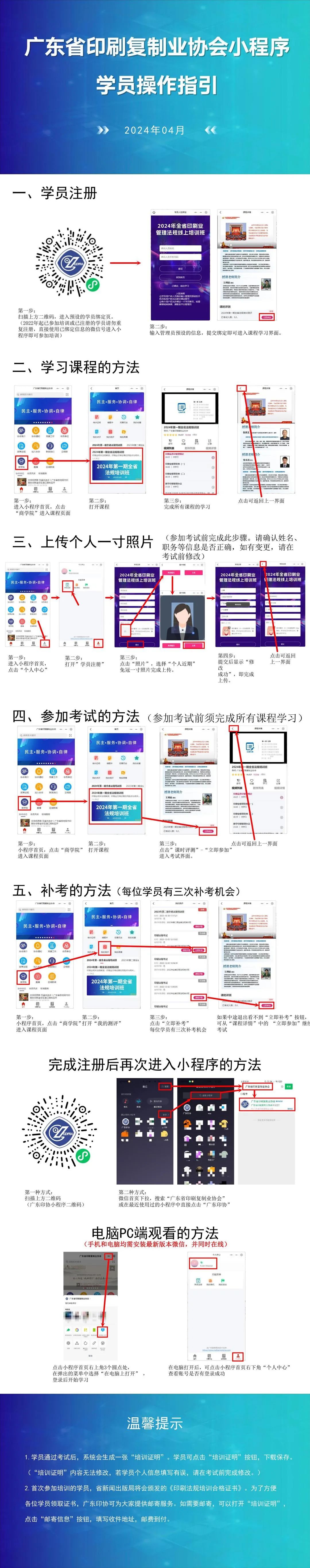 1.线上注册及集中学习操作指引。请各参训人员根据《学员线上注册及集中学习操作指引》(详见附件2)的操作步骤进行注册、参训及考试。注册完成后,方可参加学习。注册时,参训人员须上传本人小一寸白底免冠照片电子版(尺寸为2.2cm*3.2cm,像素为295*413),以用于制作证书。
